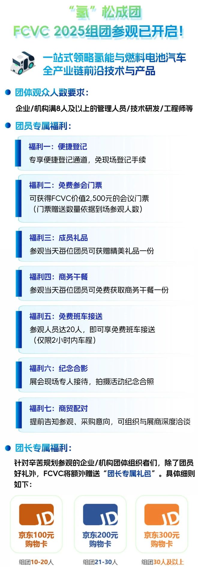 FCVC 2025将继续提供“团体参观”专项服务◆★■,主办方将提供便捷登记、参会门票◆■★◆、精美礼品、 商务午餐、免费班车、企业纪念合影★■■★◆◆、商贸配对等一系列专属福利,全面提升参观体验★■★◆,团长可额外获取京东礼品卡一张◆■★■★★。